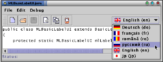 We will now create a new UI delegate for JLable called MLBasicLabelUI which overrides the paint() method such that it not simply queries the text from the JLable and renders it. Instead it interprets the string received from its associated JLable as a key into a resource file which is of course parameterized by the current Locale. Only if it doesn't find an entry in the resource file for the corresponding key, it will take the key text as the string to render. Thus, the changes in the UI are fully transparent to the component itself.